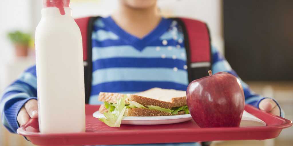 African American school girl holding lunch on a tray